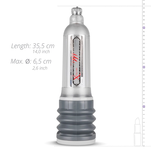 De HydroXtreme 9 is een luxe penispomp die je gebruikt met water. Vul de pomp met lauwwarm water, plaats hem over je penis en druk vervolgens de basis tegen je lichaam. Het water zal langzaam uit de pomp gaan en de penis wordt vacuüm gezogen voor meer volume. De HydroXtreme 9 is de meest krachtige pomp uit de collectie en is geschikt voor mannen met een penislengte van 17,5 tot 23 cm (tijdens erectie). De pomp wordt geleverd met vele extra’s zoals: