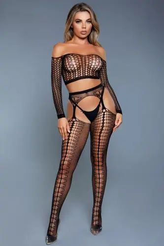 Deze opvallende 2-delige set is speciaal ontworpen voor dames met mooie curves! De set bestaat uit een off-shoulder top met lange mouwen en een jarretelgordel met aangehechte kousen. Deze set is comfortabel te dragen en heeft een mooie pasvorm dankzij het elastische materiaal.