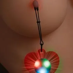 Val heerlijk op met deze unieke tepelklemmen met LED verlichting! De hartvormige verstelbare klemmen hebben een vinyl coating en zijn eenvoudig op de tepel te plaatsen. Door het ringetje omhoog te schuiven, bepaal je de gewenste intensiteit. Je kiest tussen de 3 verschillende licht patronen door op het midden van het lampje te drukken. Houd het midden iets langer ingedrukt en de verlichting schakelt uit. Het lampje werkt op batterijen (inbegrepen). Deze kun je niet vervangen maar er zijn wel reserve lampjes verkrijgbaar.