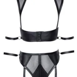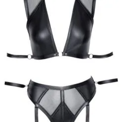 Deze 2-delige set is perfect voor een ondeugende avond! De matte look set heeft transparante en decoratieve details. De bijpassende slip heeft praktische en erotische drukknoopjes in het kruisje en de dijharnassen zijn afneembaar. De arm- en handboeien hebben een verstelbare klittenbandsluiting en zijn ook afneembaar. De set draagt comfortabel dankzij het elastische materiaal.