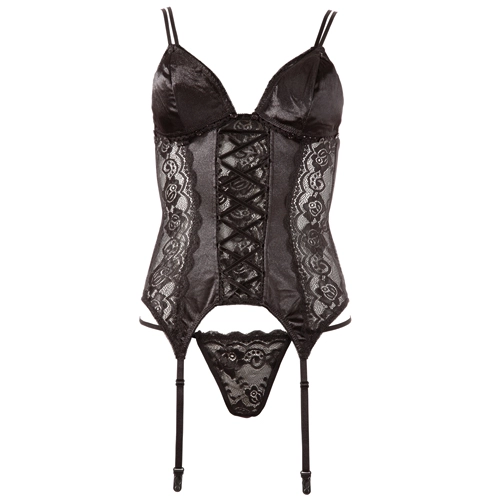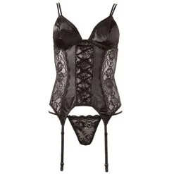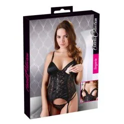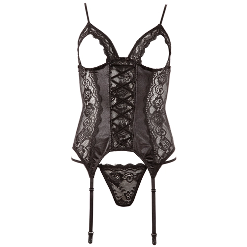 Bustier gemaakt van kant en elastisch satijn. De cups kunnen verwijderd worden met behulp van kleine knoopjes waardoor open cups worden gecreëerd. De bandjes zijn verstelbaar en een bandje is te verwijderen. Met haaksluiting op de rug. Met vier aanpasbare jarretel bandjes. Inclusief string. Zonder kousen.