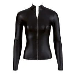 Een stoer wetlook shirt met lange mouwen. Wetlook kleding zorgt voor een uitdagende look en is perfect om te dragen in de slaapkamer of tijdens sexy feestjes. Het shirt heeft een sterke, zilverkleurige rits in het midden waarmee je zelf bepaalt hoe diep je decolleté is. Wetlook is zacht en rekbaar voor een mooie pasvorm en optimaal comfort.