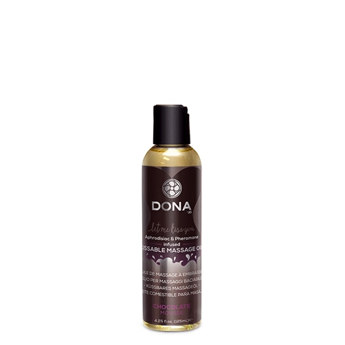 Een vervelend minpuntje bij een massage, kan de massageolie zijn. Sterke geuren zoals eucalyptus of pepermunt ruiken vaak wel aangenaam. Maar wanneer je hierna je partner kust, daar waar je net olie hebt aangebracht, blijkt de smaak tegen te vallen. Dona Kissable Massage Olie Chocolate, is hiervoor de ultieme oplossing. Deze heerlijke massageolie verzorgt de huid en is eet- en likbaar. Deze olie bevat feromonen voor een nog intenser geurbeleving. Jullie zullen niet van elkaar af kunnen blijven!
