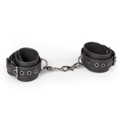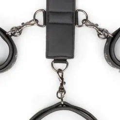 Laat jouw ondergeschikte maar zien wie de baas is met deze bondage set. De set bestaat uit een strap-on harnas, handboeien en een halsband. Zowel de boeien als de halsband zijn gemakkelijk verstelbaar voor een perfecte pasvorm. Het stevige kunstleer is gevoerd met schuimrubber om schrammen te voorkomen en het zorgt ervoor dat het comfortabel in het gebruik is. De bondage strap heeft negen kleine d-ringen en één grote d-ring. De handboeien en de halsband hebben aangehechte clipsluitingen zodat je ze makkelijk aan het harnas kan bevestigen. Door de lengte van de strap en de vele d-ringen, kan je je eigen bondagespel creëren en kan je deze set op welke manier dan ook gebruiken.