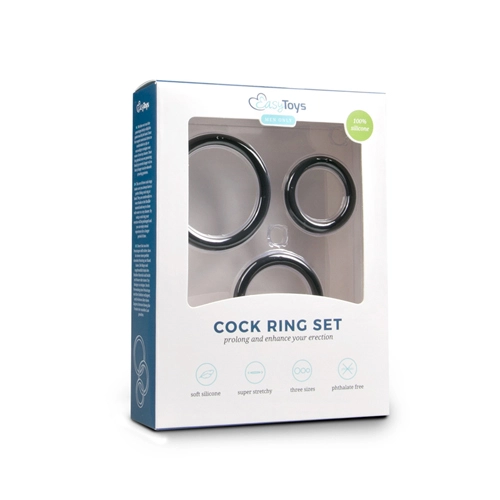 Erotische, zwarte cockring set van EasyToys Men Only. Met een cockring geniet je langer van je erectie. Perfect voor de mannen die snel klaarkomen. Met een penisring wordt je erectie uitgesteld waardoor jij en je partner meer plezier beleven tijdens de seks. De drie ringen hebben allemaal een andere maat zodat er altijd eentje bij zit die jou uitstekend past. De ringen zijn gemaakt van zachte en gladde siliconen waardoor je geniet van een comfortabele pasvorm.