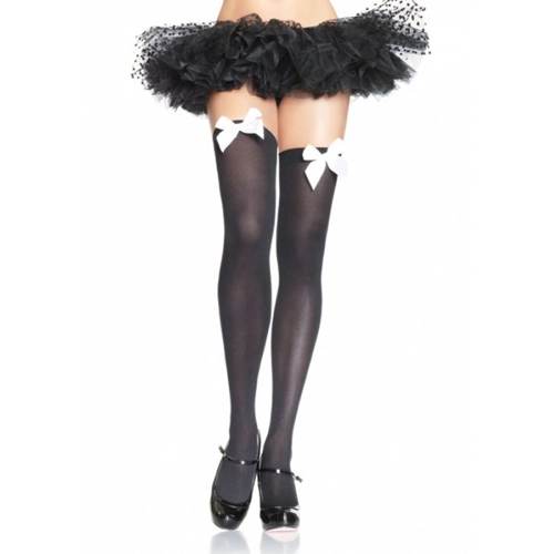 Deze zwarte kousen hebben een brede kanten rand met een grote strik en staan prachtig onder een kanten lingerie in combinatie met jarretels!