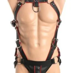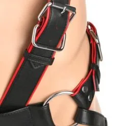 Dit sexy zwart en rood kunstlederen harnas met metalen ringen kan je lichaam laten zien en tegelijkertijd de bandjes vastmaken aan een cockring, waardoor je je helemaal gebonden voelt. Het is supersterk. Aan de basis van het harnas zit een cockring met een diameter van 5 cm, die het dubbele doel heeft, je erectie te verbeteren en het harnas op zijn plaats te houden. Je kunt ervoor kiezen om je delen bloot te geven of te bedekken met een bijpassende brede jockstrap. De jockstrap bedekt de voorkant, maar laat toch je achterkant zien met twee bandjes die om je dijen gaan en een riem die om je middel gaat.