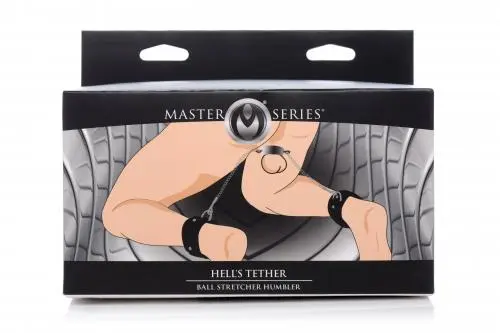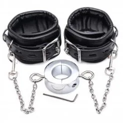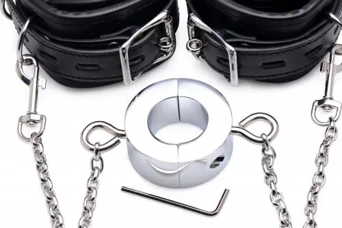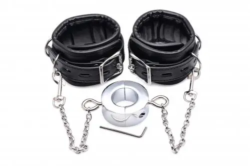 Ga door de knieën, geef jezelf totaal over en wacht op verdere instructies met deze intense Hells Tether Ball Stretcher. Deze ball stretcher is niet voor beginnelingen en vraagt een ijzeren discipline! De metalen ring wordt om de balzak bevestigd en op slot gedaan. De aangehechte boeien gaan om de enkels zodat de bewegingsvrijheid zeer beperkt wordt. Deze ball stretcher heeft een mooi en stoer design en wordt geleverd met een inbussleutel. De boeien zijn ruim verstelbaar en voorzien van stevige gespen en afneembare sloten.