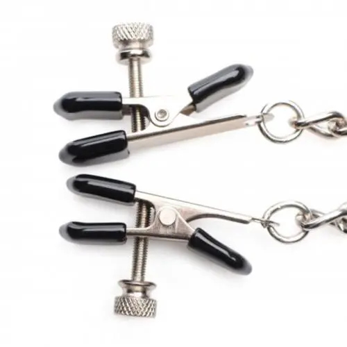 Verras jouw partner met deze sierlijke maar venijnige tepelklemmen! De klemmen zijn verstelbaar en vormen onderdeel van een y-vormige metalen ketting. Aan het eind van de ketting hangt een mooi gevormd gewichtje van 59 gram. Het metaal is nikkelvrij