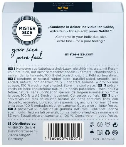 De condooms van het Duitse merk Mister Size worden gemaakt in diverse maten, zodat je altijd een perfect passend condoom kunt vinden.