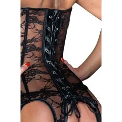 Dit zwarte korset combineert kant en uitdagend wetlook voor een unieke look. Het korset is strapless en heeft een haaksluiting aan de voorkant. De zijkanten zijn gemaakt van doorschijnend, elastisch kant voor een verleidelijke look. De achterkant is voorzien van een wetlook rijgveter die je zelf kunt strikken. De lange jarretels zijn voorzien van clipjes die je makkelijk aan je kousen kunt bevestigen.