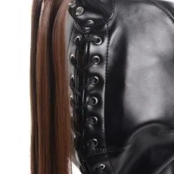 Dit kinky bondage hoofd masker is ideaal voor een rollenspel! Het masker heeft een luxe uitstraling en een stoute paardenstaart bovenop. Je kunt het masker met behulp van een rijgveter aan de achterzijde, volledig verstellen en zo ben je verzekerd van een mooie pasvorm. Het materiaal is vegan leder en de metalen details zijn nikkelvrij. De staart is gemaakt van synthetisch haar.
