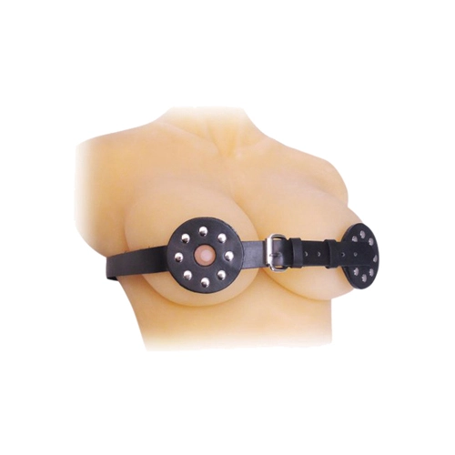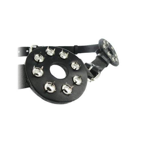 De borstplaatjes met spikes en tepelgaten zitten vast aan een stevige lederen band die om de buste valt. Zowel aan de voor- als achterzijde zit een gesp om dit accessoire naar wens aan te trekken. Maak je borst maar nat en laat je deze spannende bondageriem ombinden.