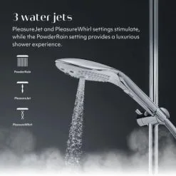 Wissel tussen verschillende instellingen: PowderRain voor een luxe douche, PleasureWhirl voor sensuele massage en PleasureJet voor krachtige pulsaties.